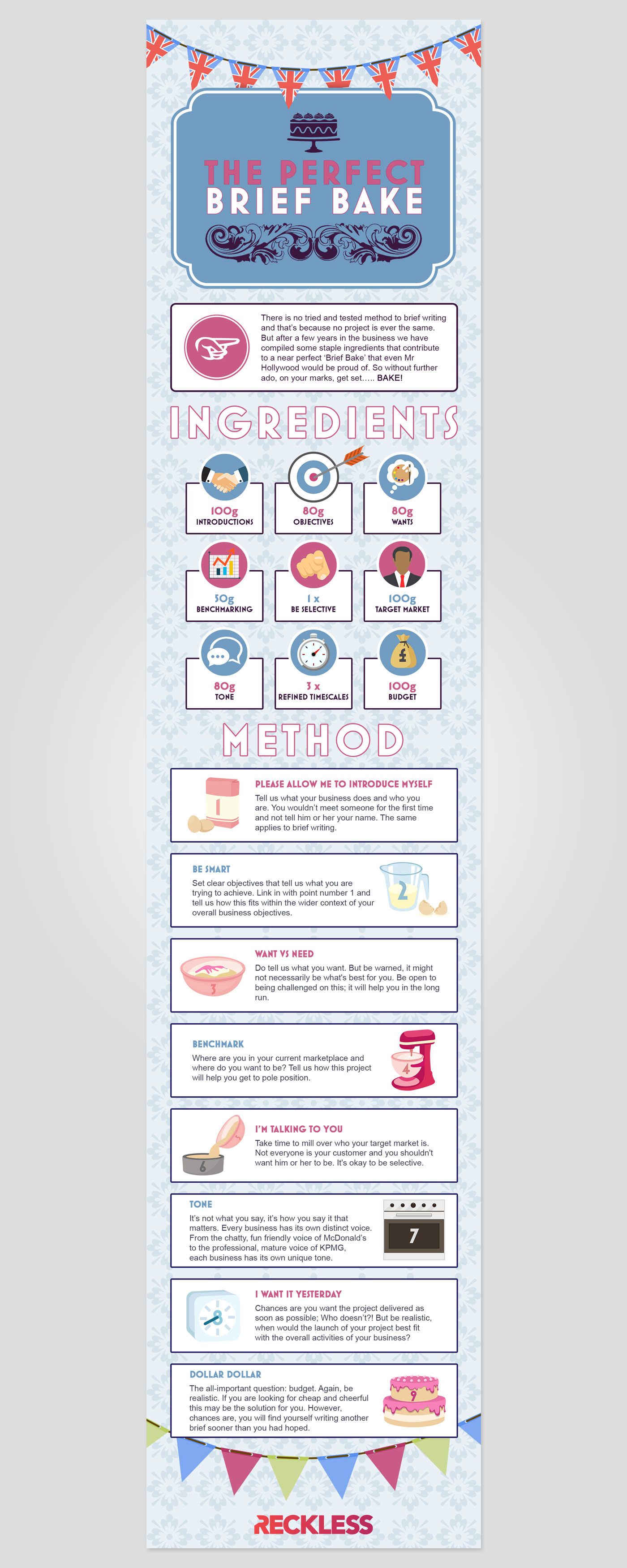 I approached Reckless in September 2016, to which they offered me a chance to create a Infographic that would appear on their blog. The Infographic had to tie in with a Great British Bake Off theme and was designed with the purpose of informing clients of Reckless what the best way was to approach them with a design brief.