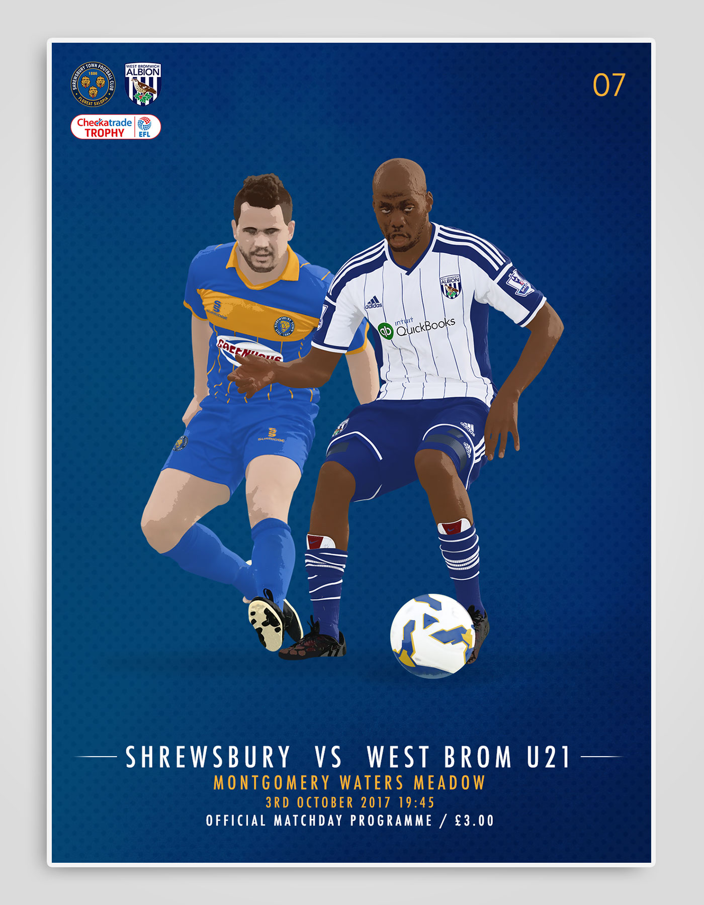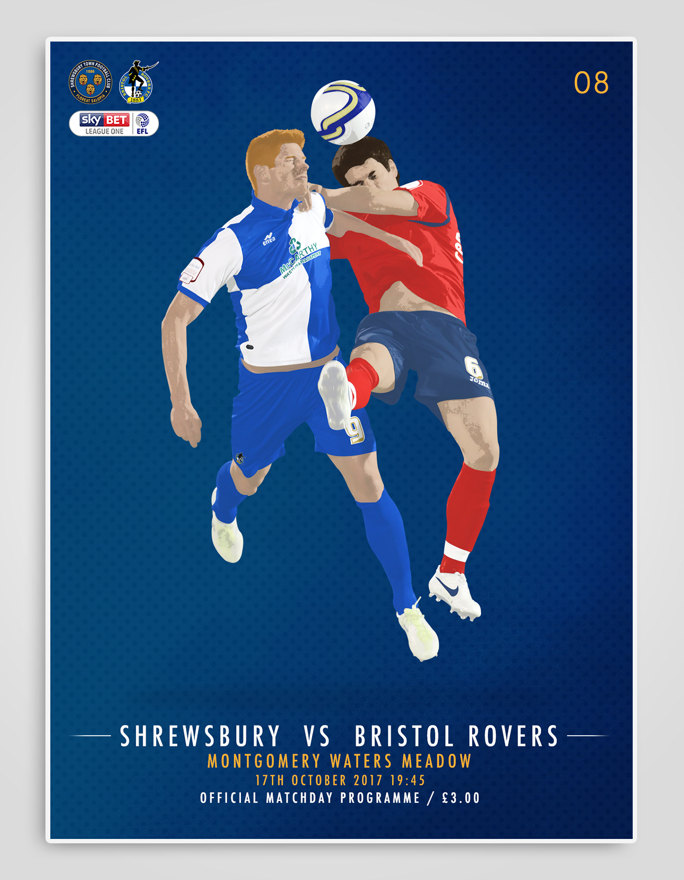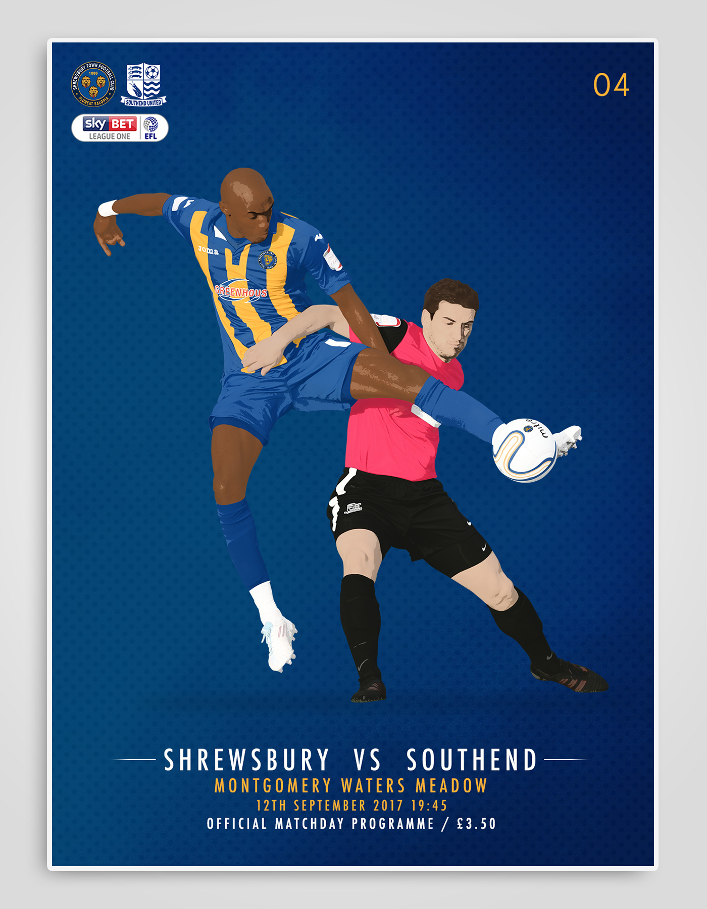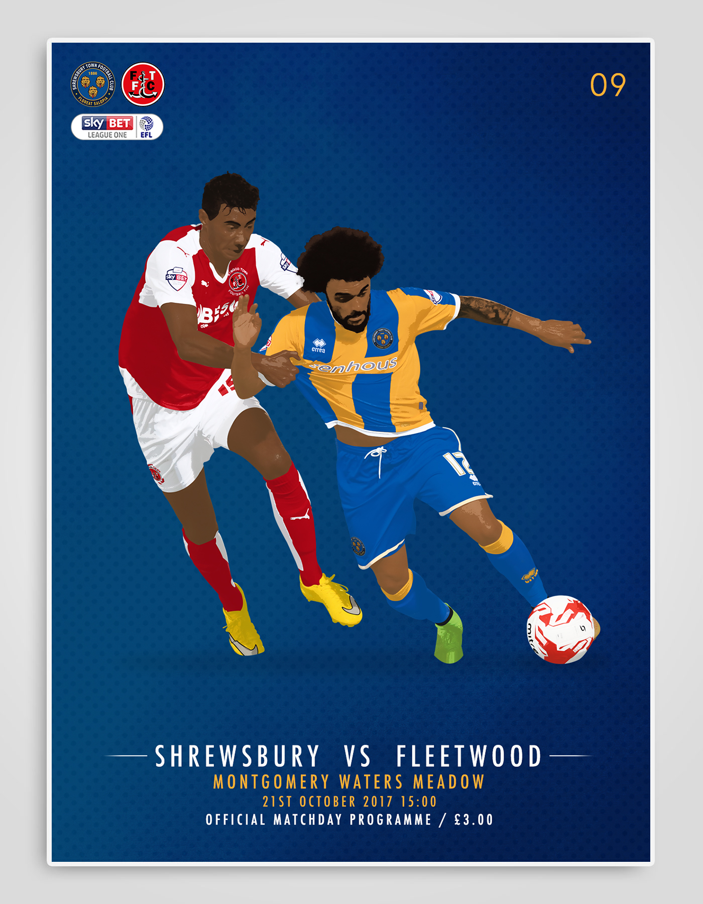 To celebrate 10 years since moving into the Montgomery Waters Meadow I was asked to create illustrated artwork of past players who had featured during the years Shrewsbury Town had been playing there. These images would then go on to feature as the front cover for each home match programme.