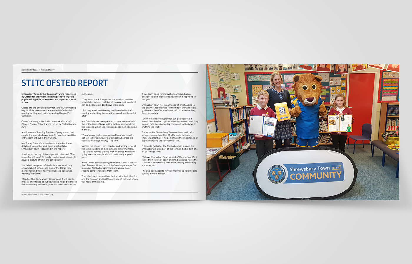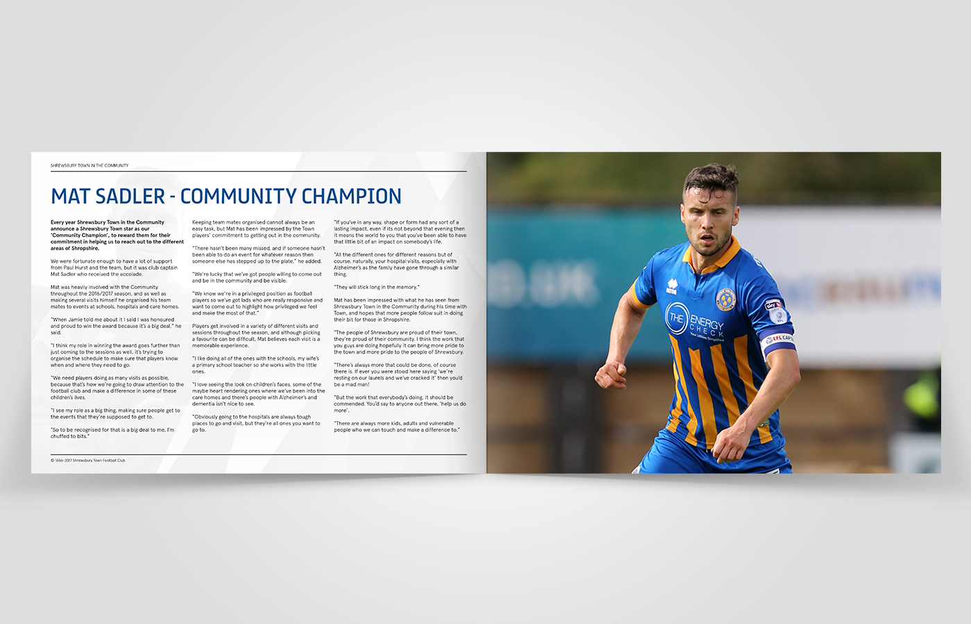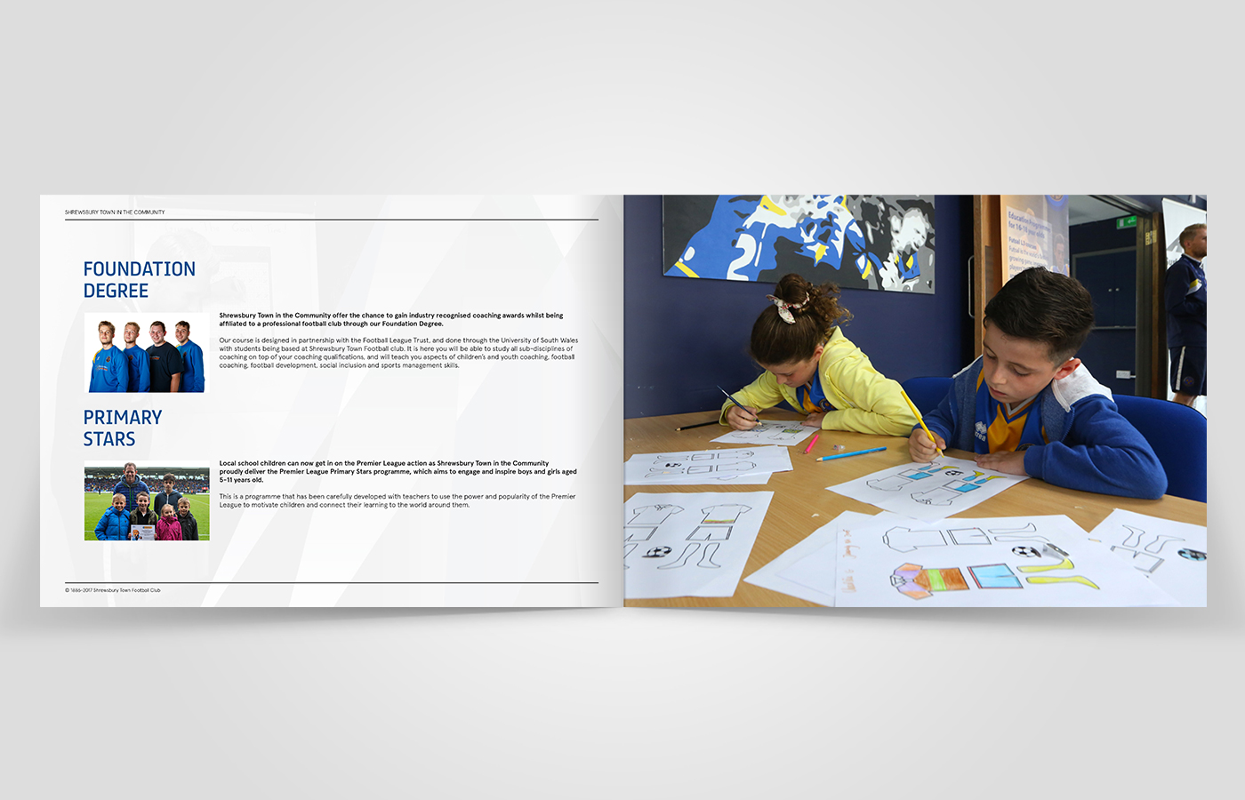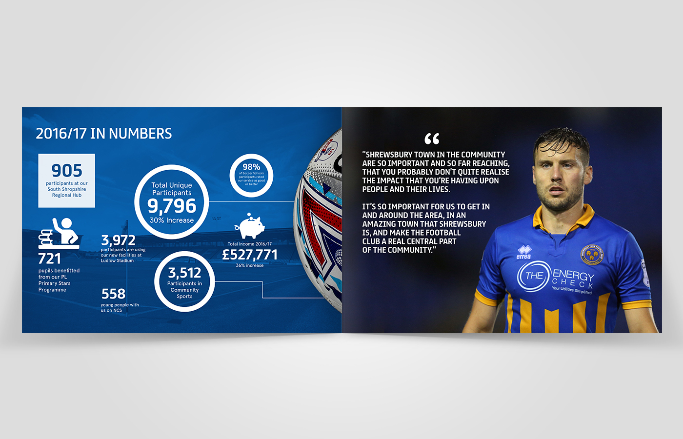 I was asked to create an annual review for Shrewsbury Town in the Community for the 2016/17 period. This brochure would contain statistics and information on what the charity had been up to over the past year and the results they had achieved.
